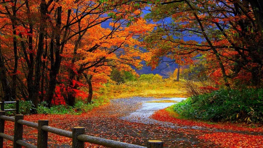 Autumn Leaves On A Path With A Fence Wallpaper