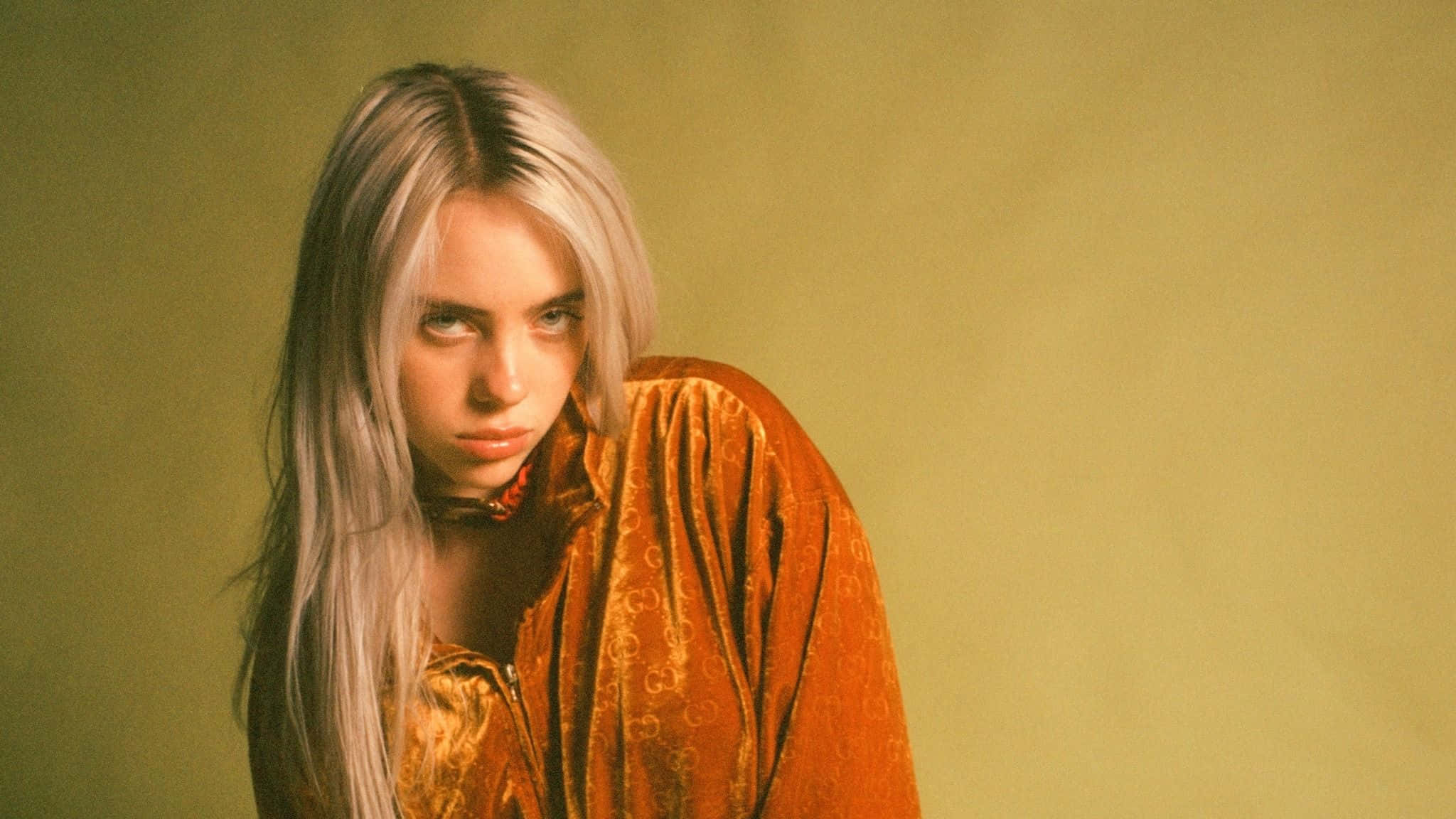 Billie Eilish Wearing Her Signature Style And Enjoying Her Laptop Wallpaper