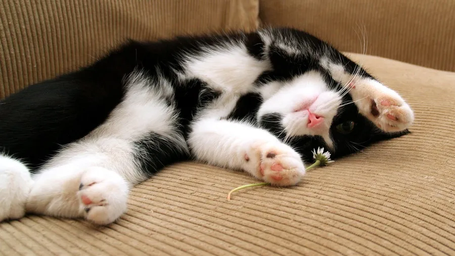 Black And White Cat Rolls Over On Brown Sofa Wallpaper