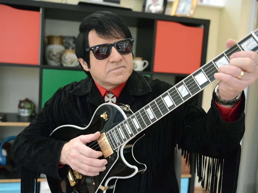 Caption: Iconic Musician Roy Orbison Masterfully Playing His Guitar Wallpaper