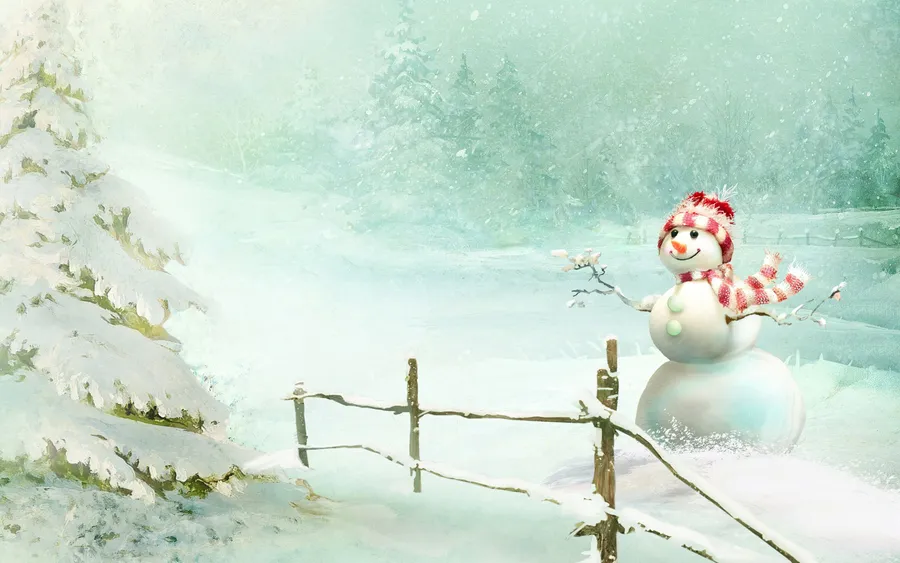 Christmas Snowman Trees Covered In Snow Wallpaper
