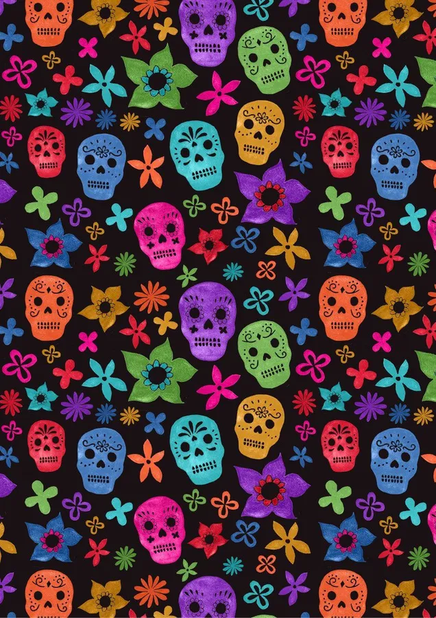 Colorful Sugar Skulls And Flowers On Black Background Wallpaper