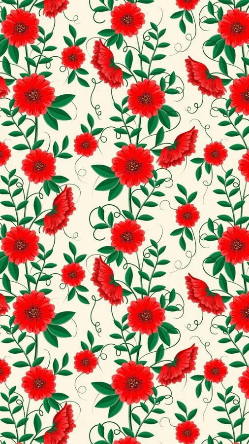 Cute Red Flowers And Green Leaves Pattern Wallpaper