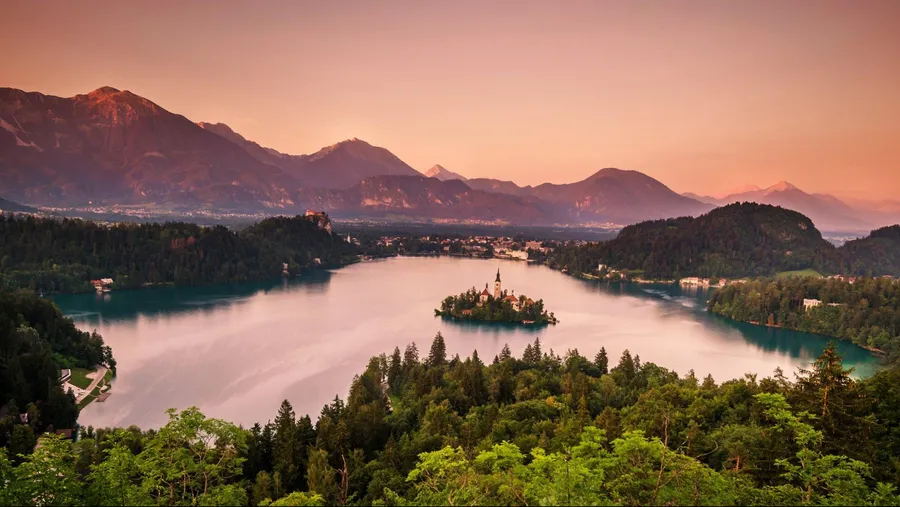 Elevated View Lake Bled At Sunrise Wallpaper
