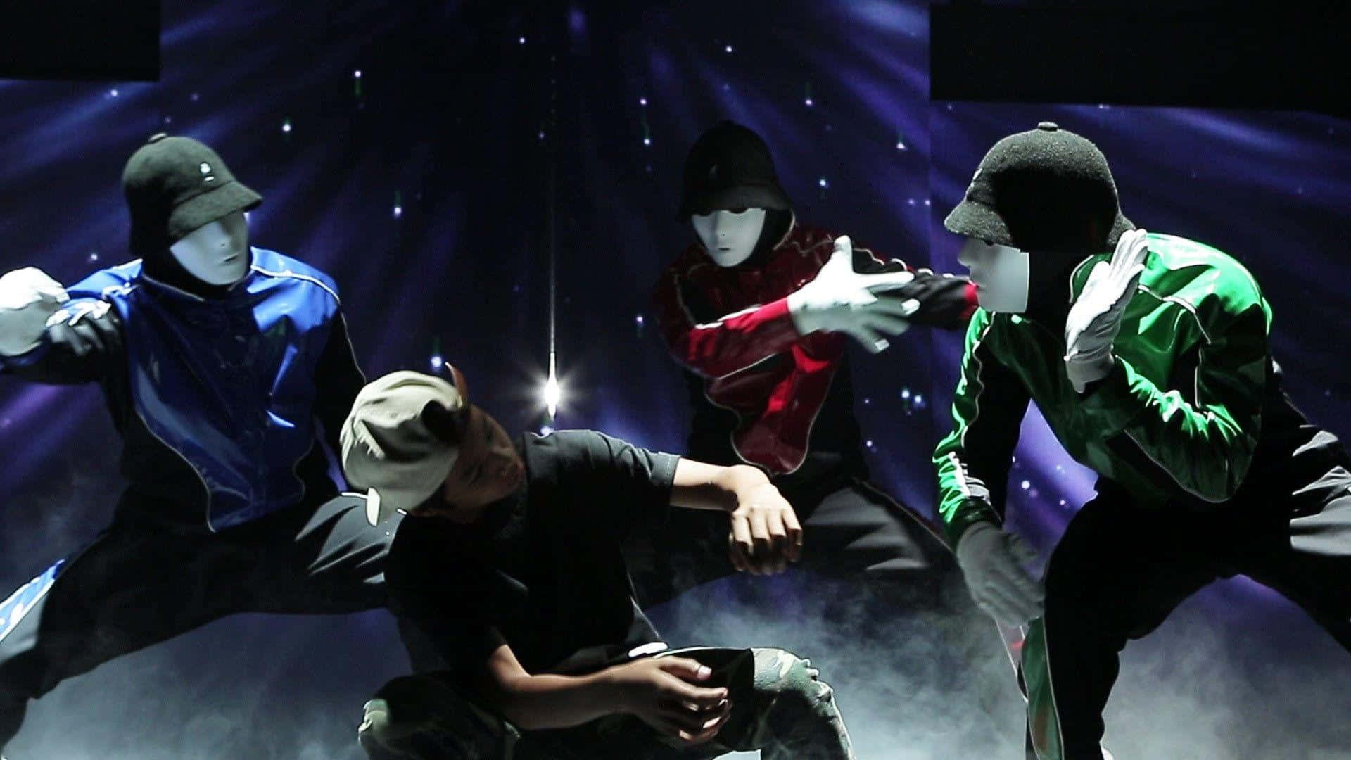 Four Men In Black And Blue Costumes Are Performing On Stage Wallpaper