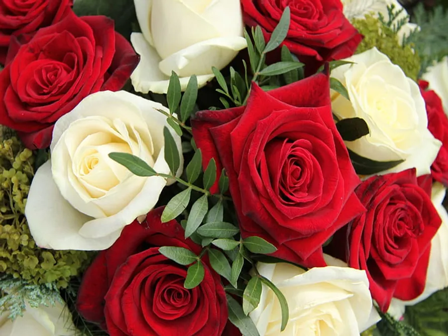 Fresh Leaves With Red And White Roses Wallpaper