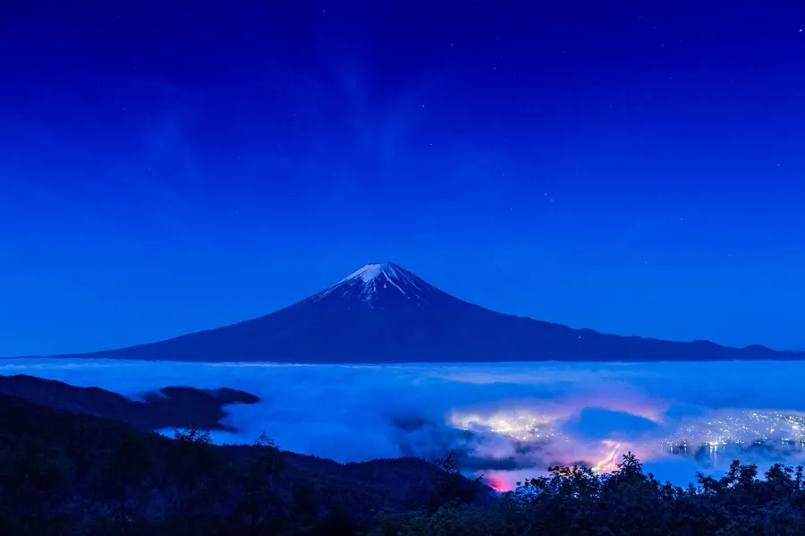 Fuji Peak Through The Clouds At Nighttime Wallpaper