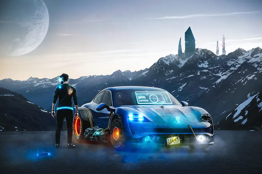 Futuristic Carand Driver Mountain Landscape Wallpaper