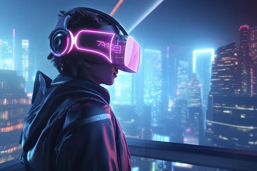 Futuristic V R Experiencein Cityscape Wallpaper