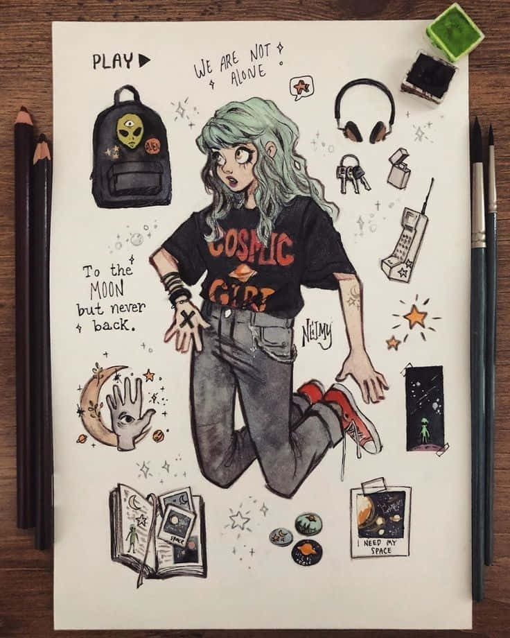 Grunge Cartoon Drawing Cosmic Girl Wallpaper