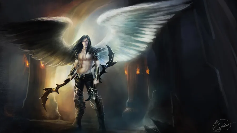 Guardian Angels With Swordings Standing In A Dark Room Wallpaper
