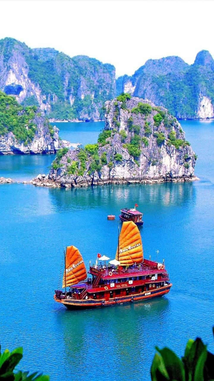 Halong Bay With Red Cruise Ship Wallpaper
