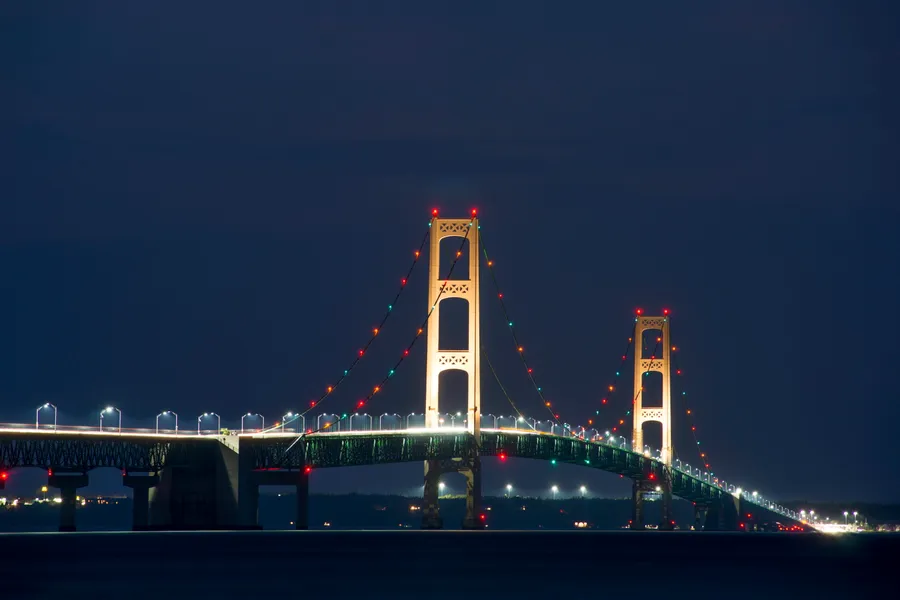 Illuminated Mackinac Bridge Under Starry Night Wallpaper