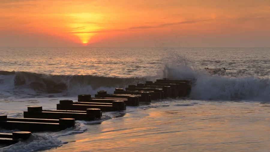 Jetty Pile With Wave On Beach Sunrise Wallpaper
