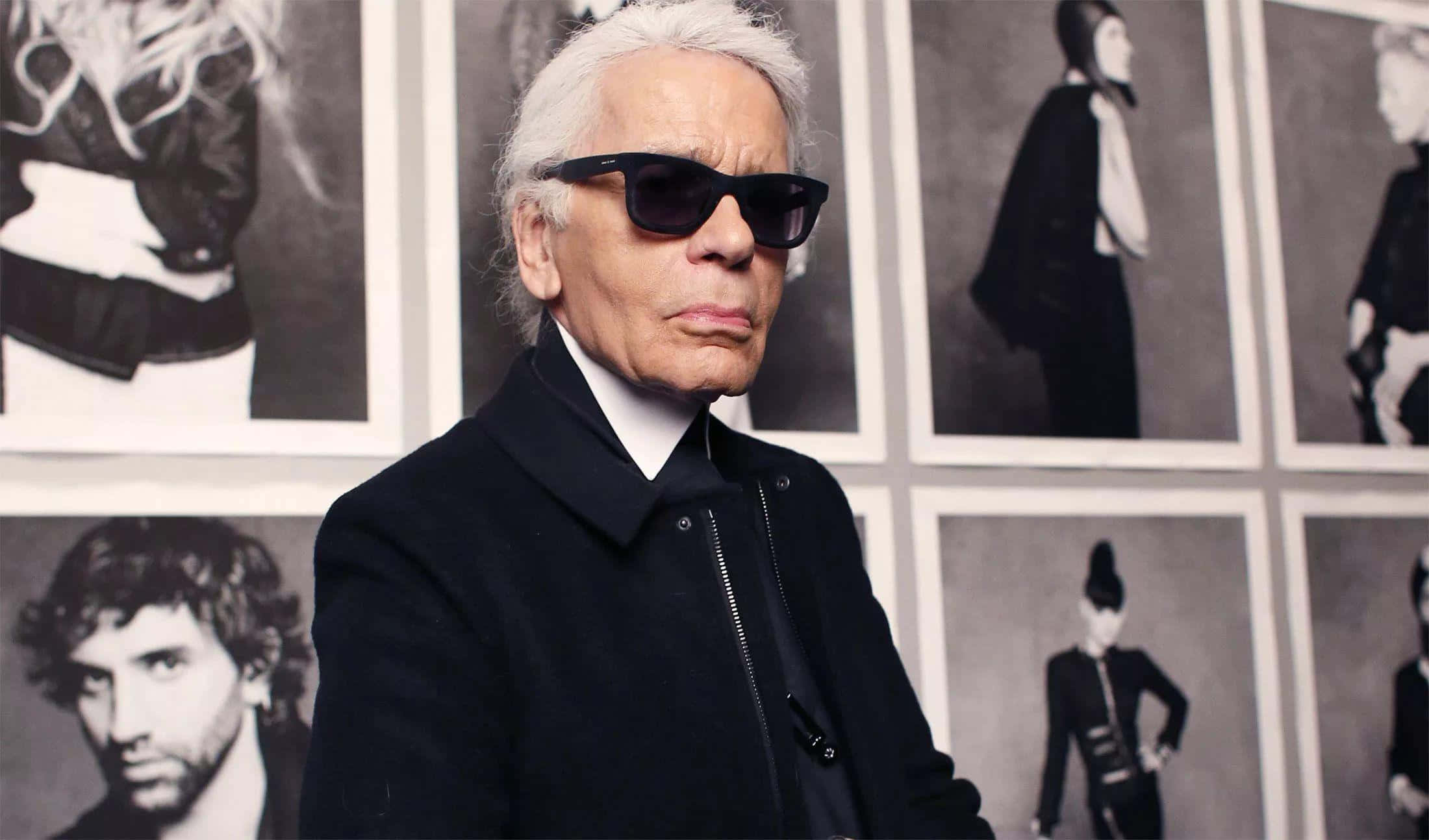 Karl Lagerfeld – A Man In Sunglasses Standing In Front Of A Wall Of Photos Wallpaper