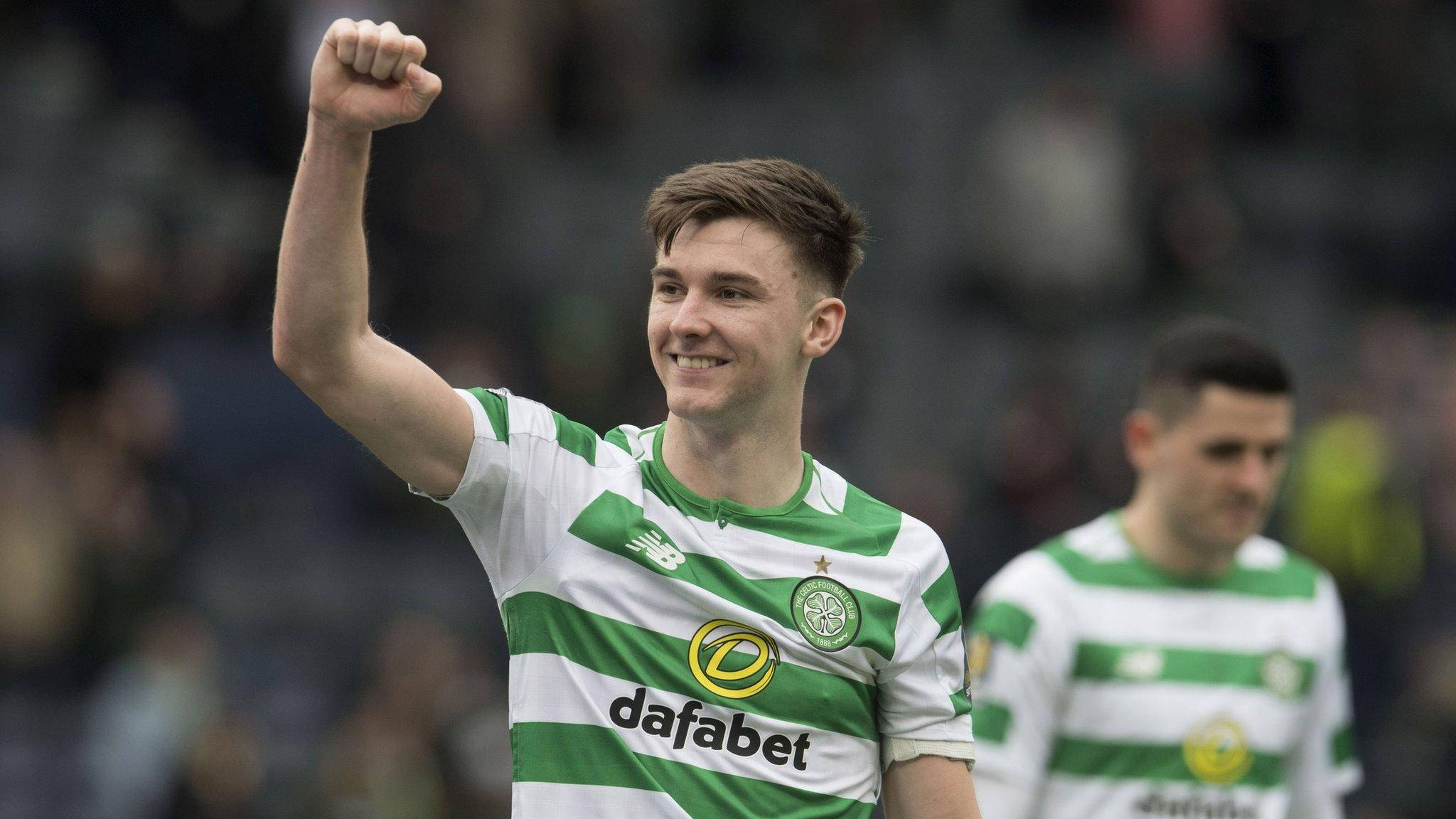 Kieran Tierney Celebrating Victory With Raised Fists Wallpaper