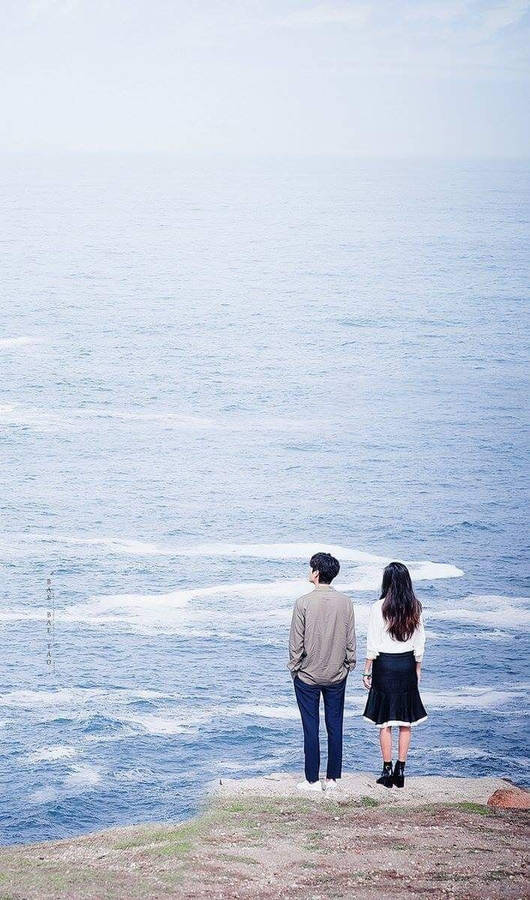 Korean Couple Standing Near The Ocean Wallpaper