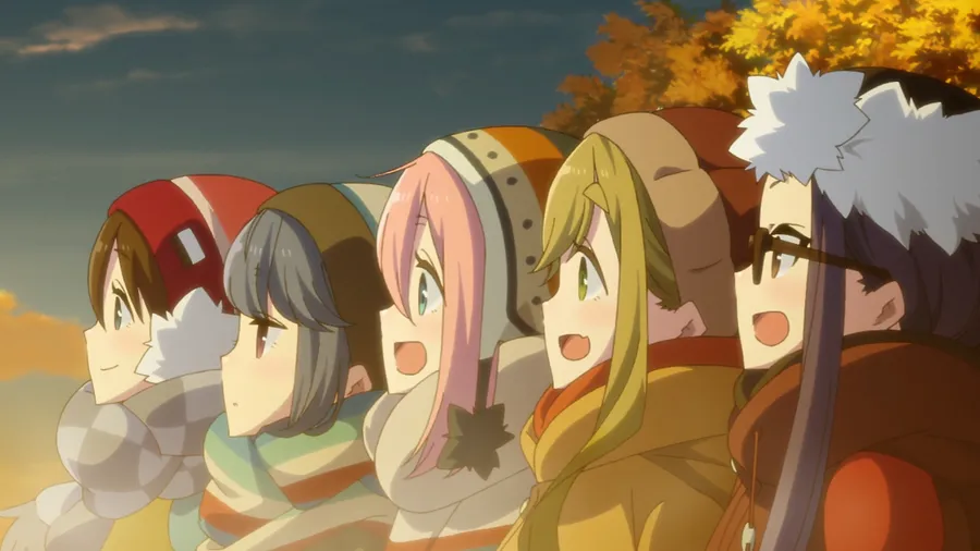 Laid Back Camp Cast Watching Sunset Wallpaper