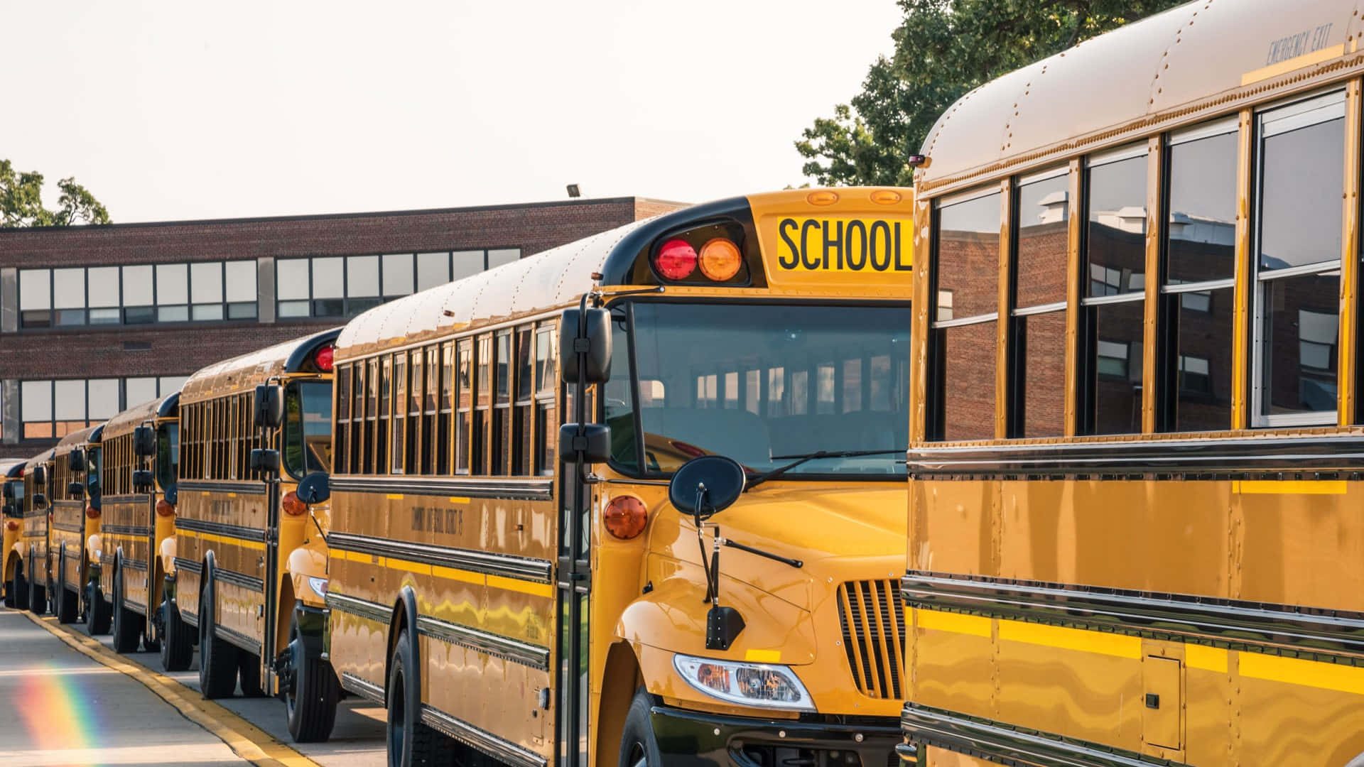 Large Fleet Of Yellow School Buses Parked At A School Wallpaper