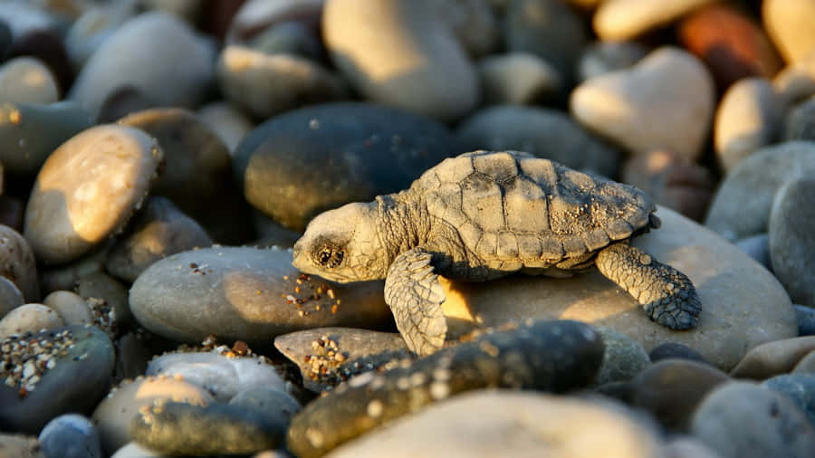 Description- A Close-up Image Of A Baby Turtle Wading In The Water. Its Shell Is Bright Shades Of Green, Yellow And Orange. The Turtle Is Adventurous And Exploring The World. Wallpaper