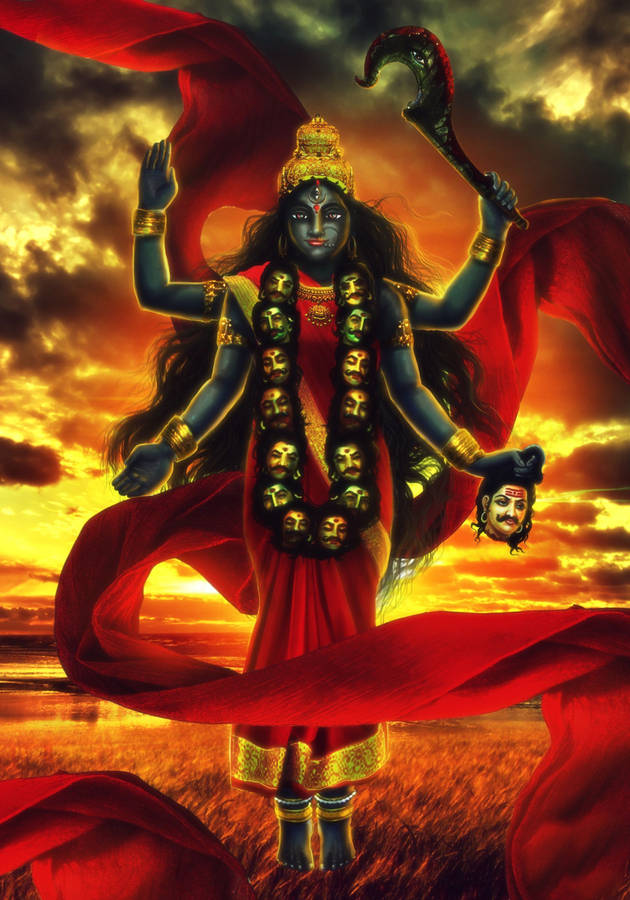 Maa Kali With Red Ribbon Orange Sky Wallpaper