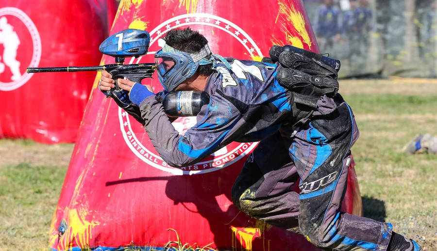 Man Beside Red Inflatable Paintball Bunker Wallpaper