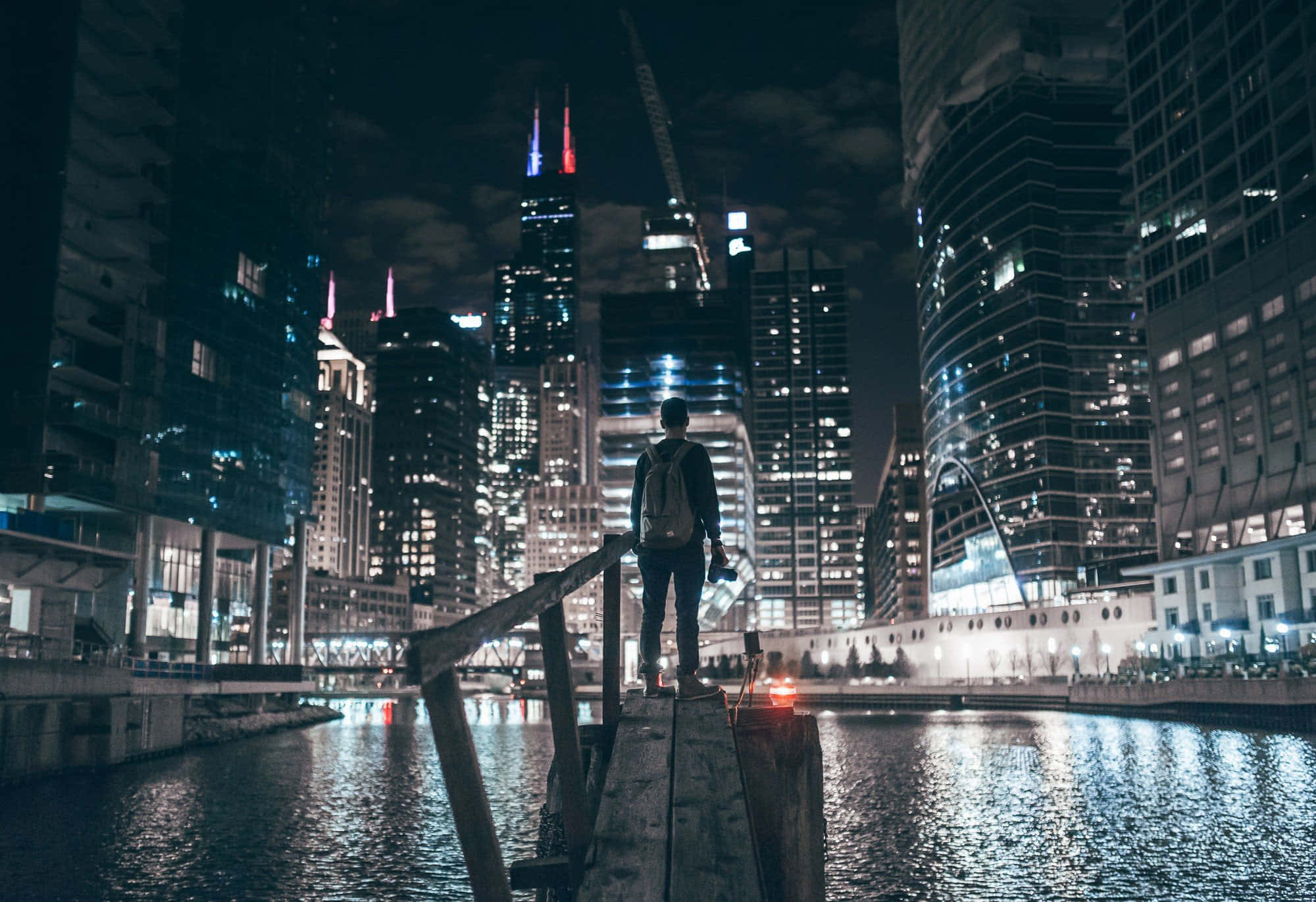 Man Standing In Chicago City Night Wallpaper