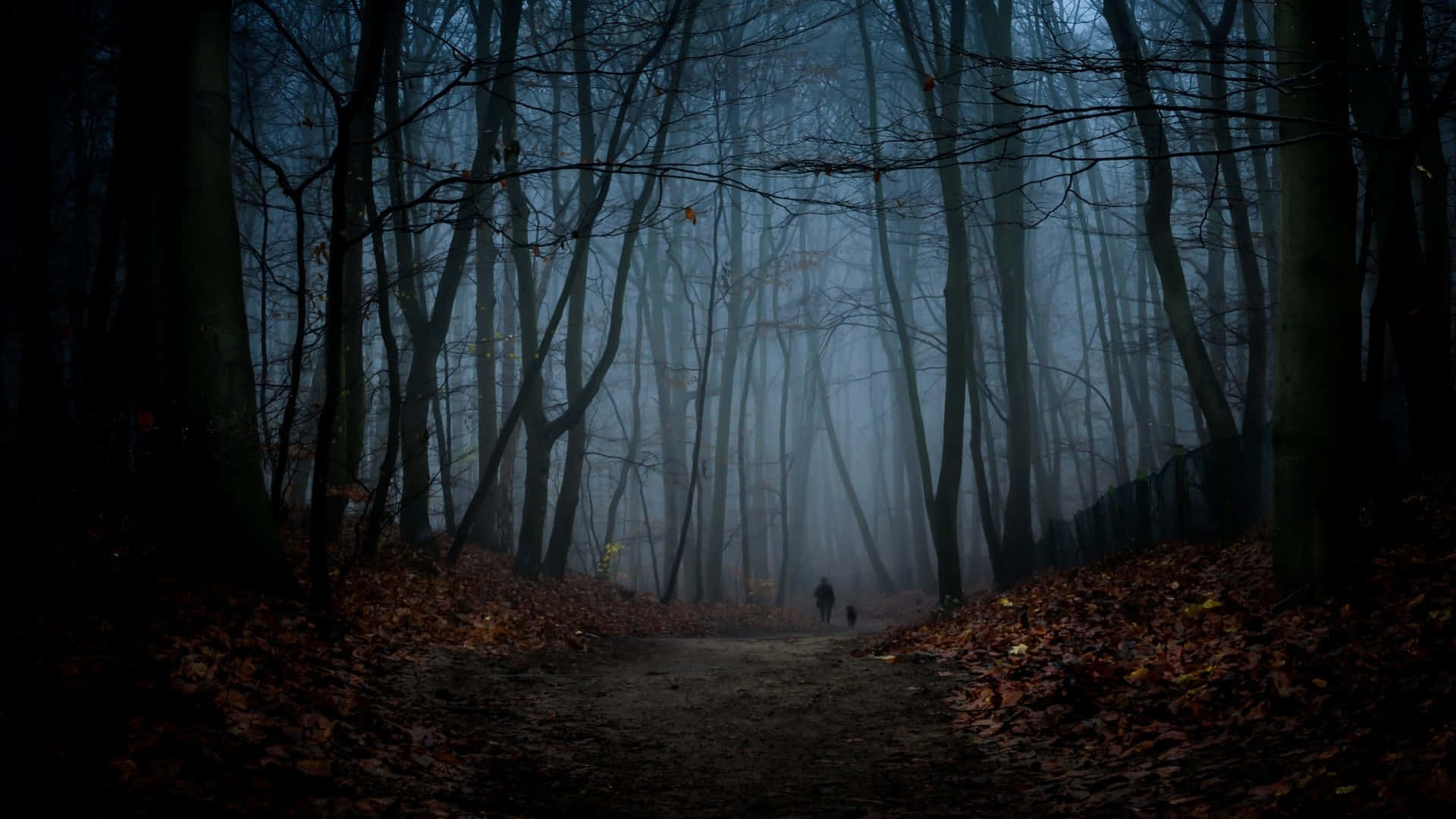 Misty Forest Pathwith Figure Wallpaper