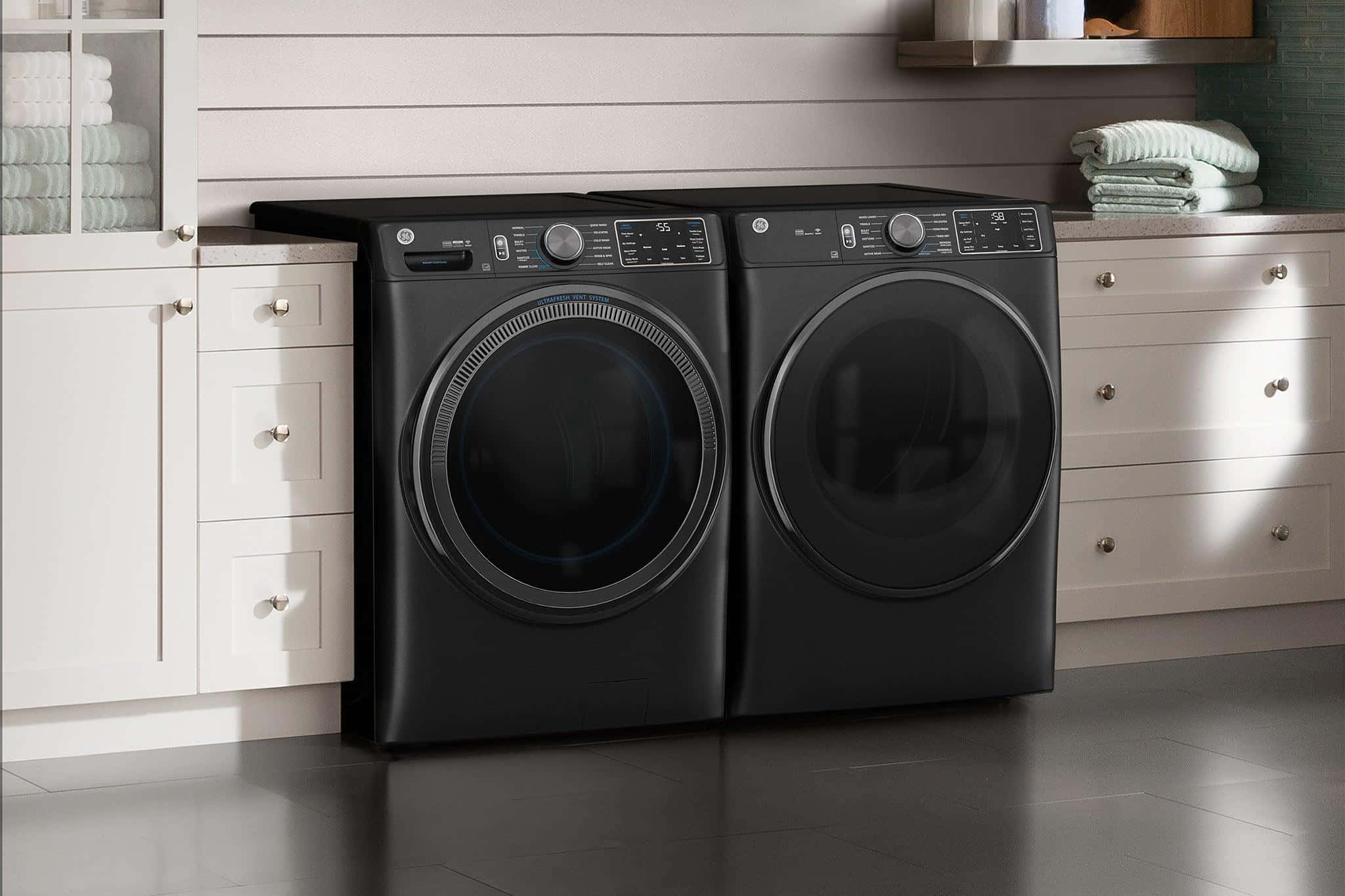 Modern Black Washing Machineand Dryer Set Wallpaper
