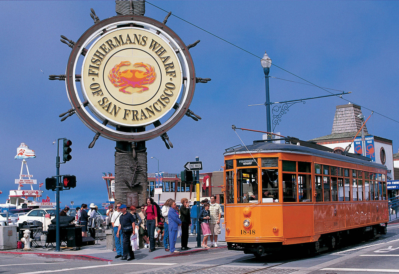 Orange Tram By Fishermans Wharf Sign Wallpaper