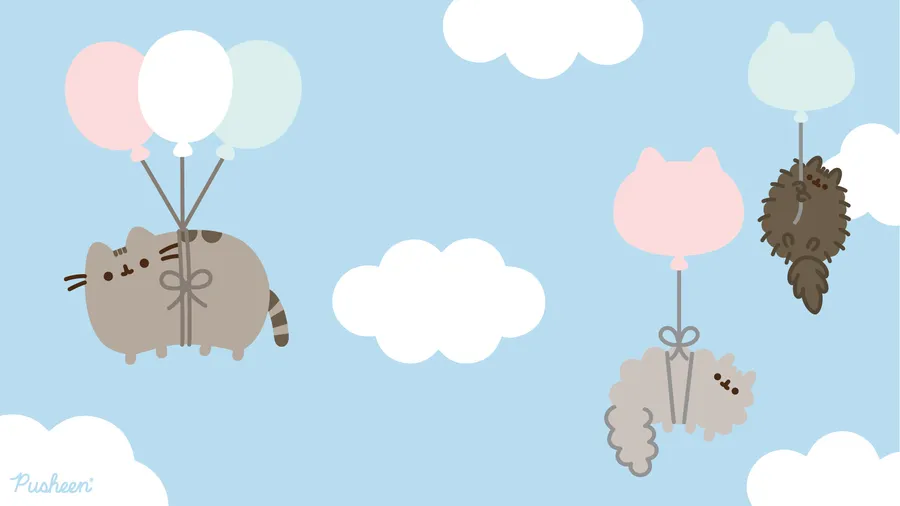 Pusheen Cat Flying In The Sky With Balloons Wallpaper