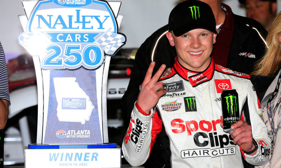 “race Car Driver Ty Gibbs With Monster Energy Drink At Promotional Event” Wallpaper