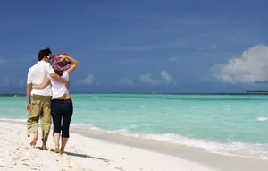 “romantic Getaway: A Couple’s Tranquil Moment On The Beach” Wallpaper