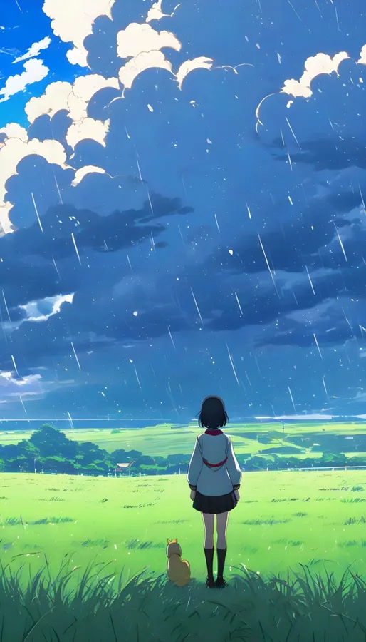Serene Rainy Countryside With Anime Girl And Cat Wallpaper