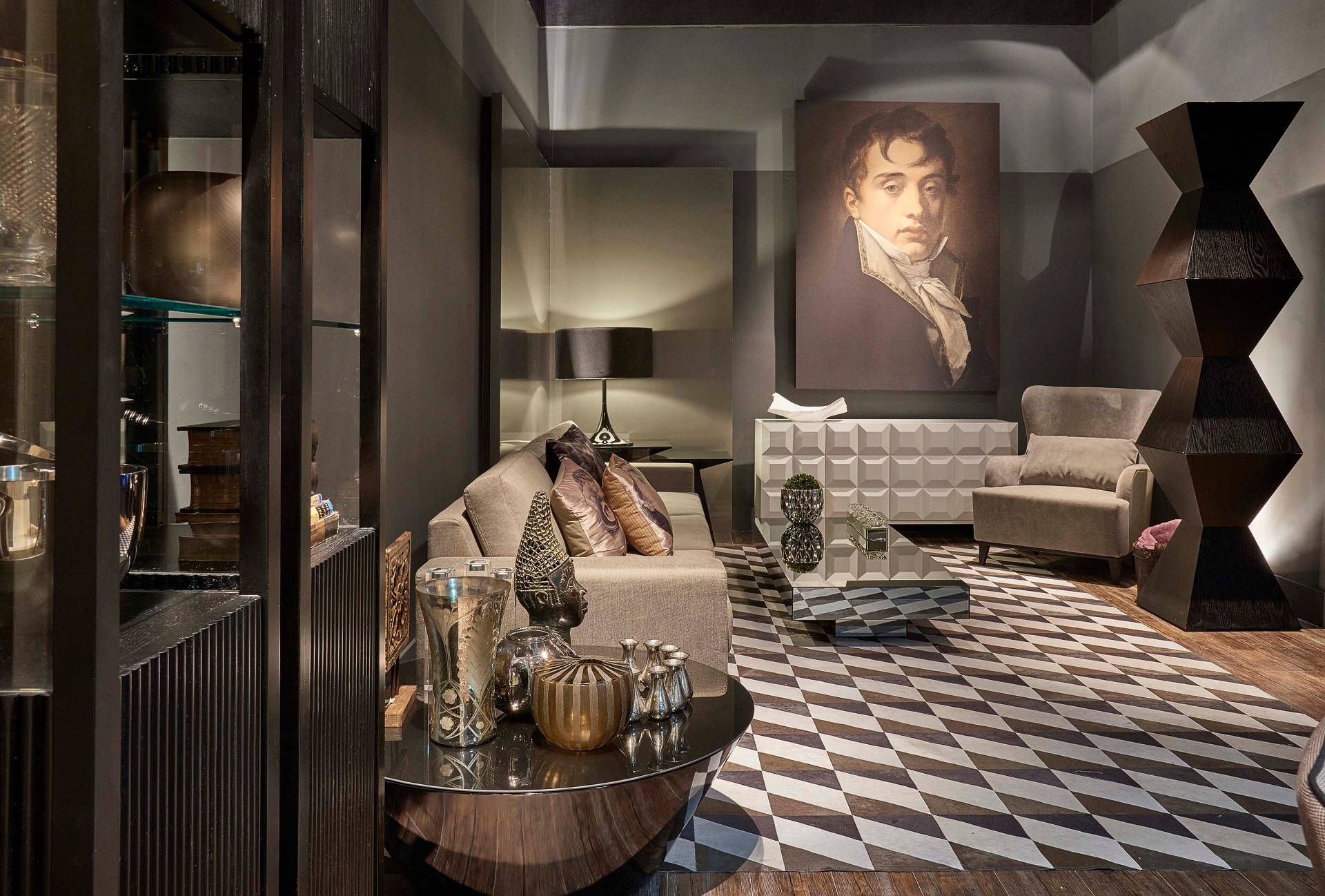 Stylish Living Room With Check Pattern Floor Wallpaper