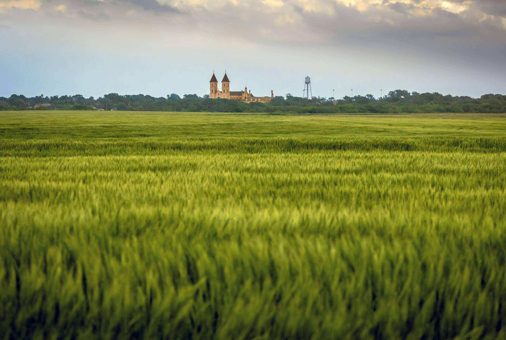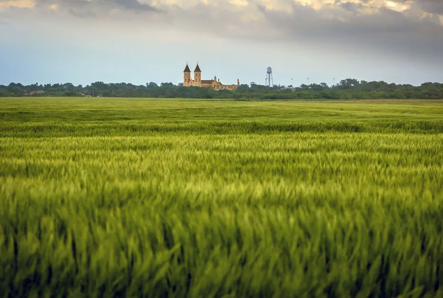 The Scenic Beauty Of St. Fidelis Basilica Surrounded By Golden Fields In Kansas Wallpaper