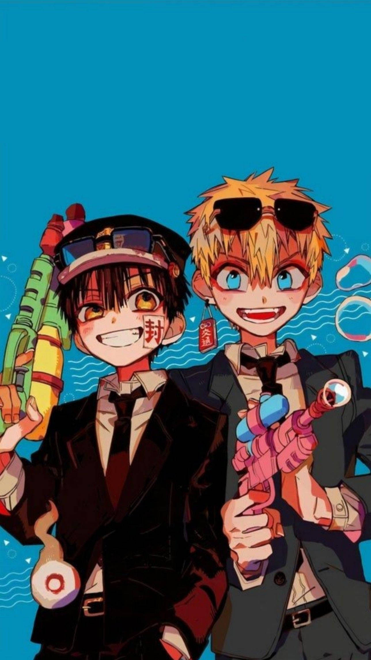 Two Anime Boys Holding Guns And Holding A Blue Background Wallpaper