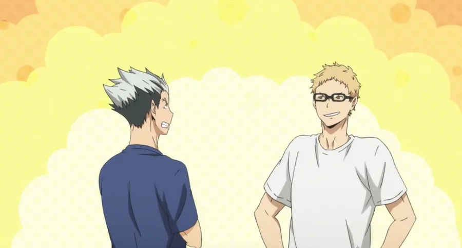 Two Anime Characters Talking In Front Of A Yellow Background Wallpaper