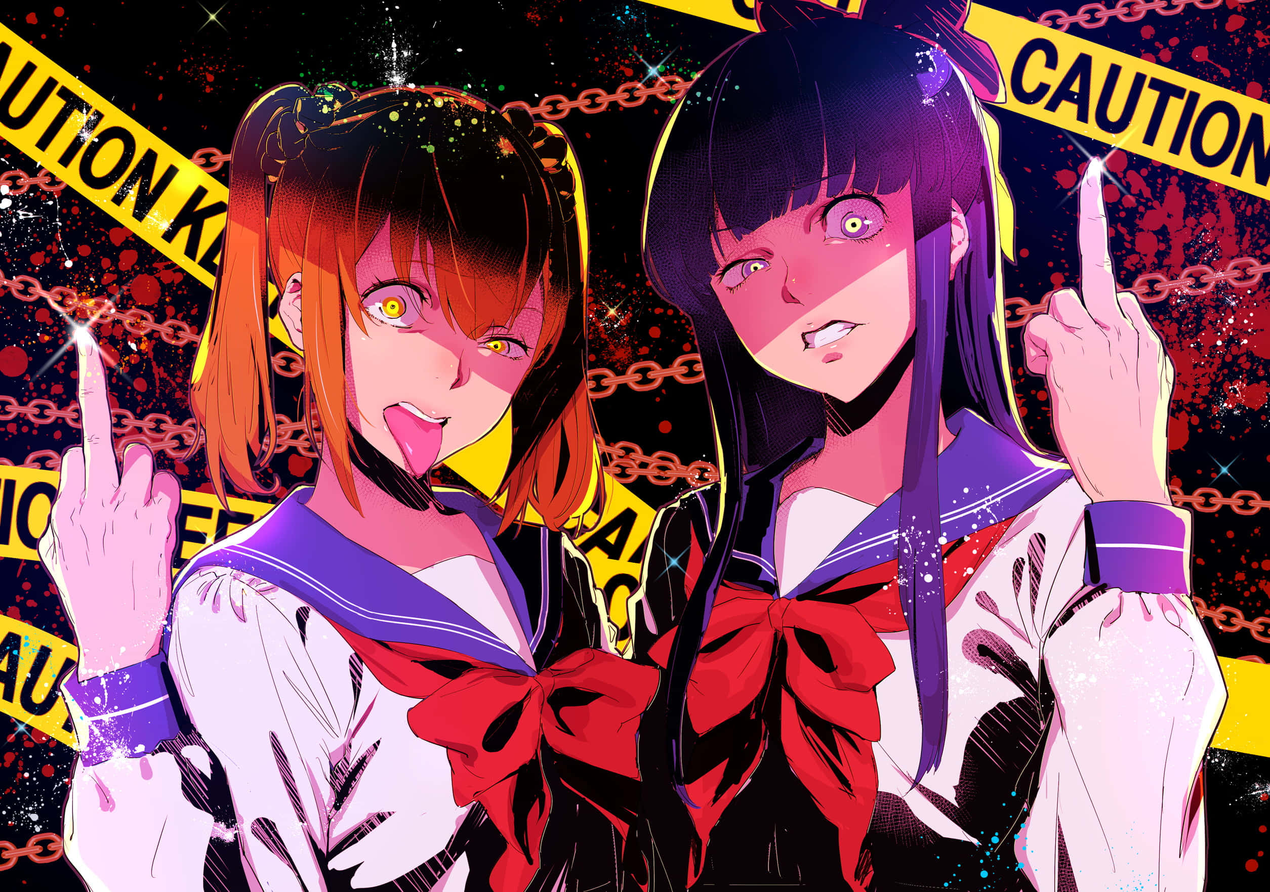 Two Anime Girls Standing In Front Of Caution Tape Wallpaper