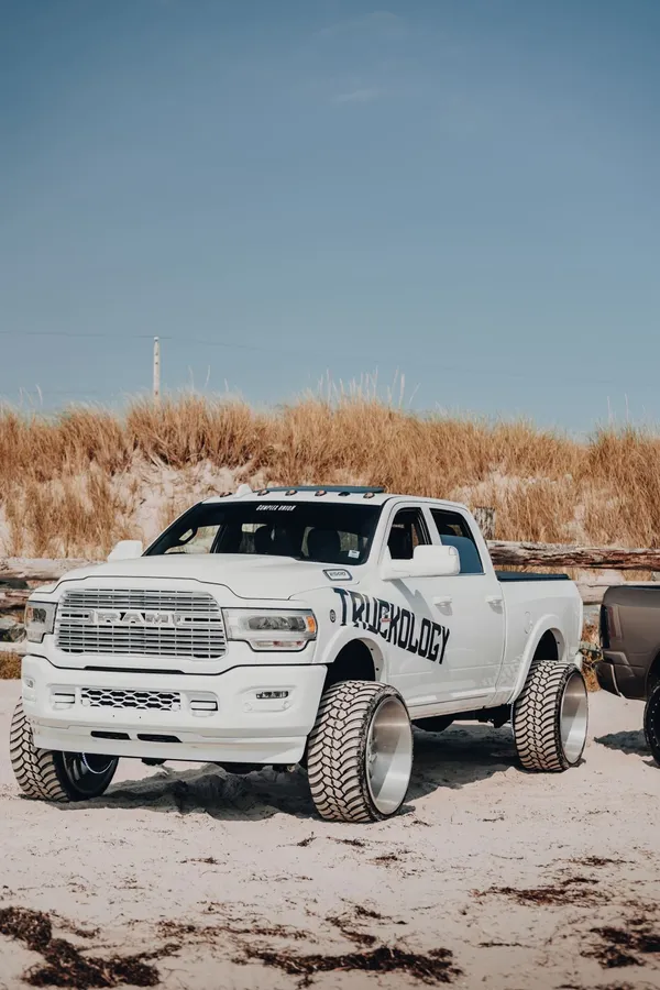 Two White Trucks Parked On The Beach Wallpaper