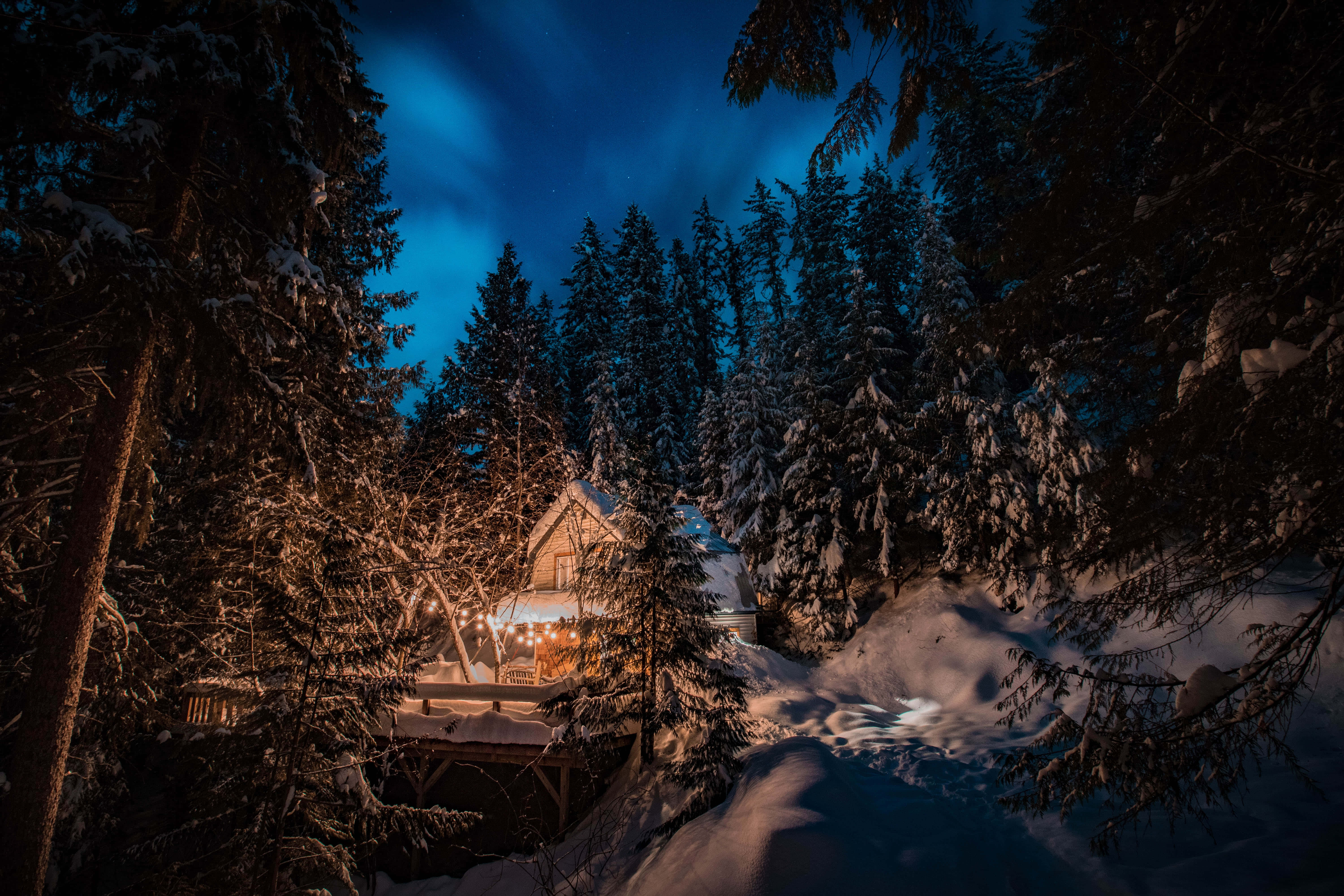 Winter Night Desktop With Cabin In The Woods Wallpaper