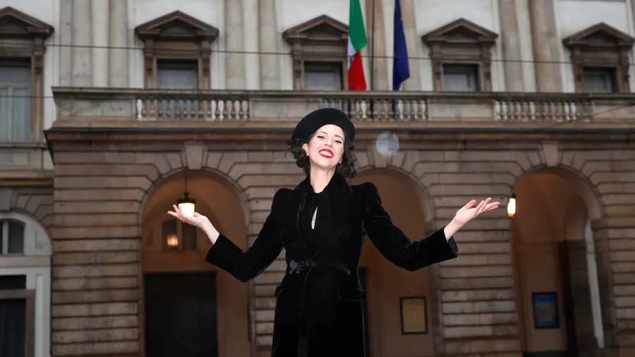 Woman Posing Outside La Scala Opera House Wallpaper