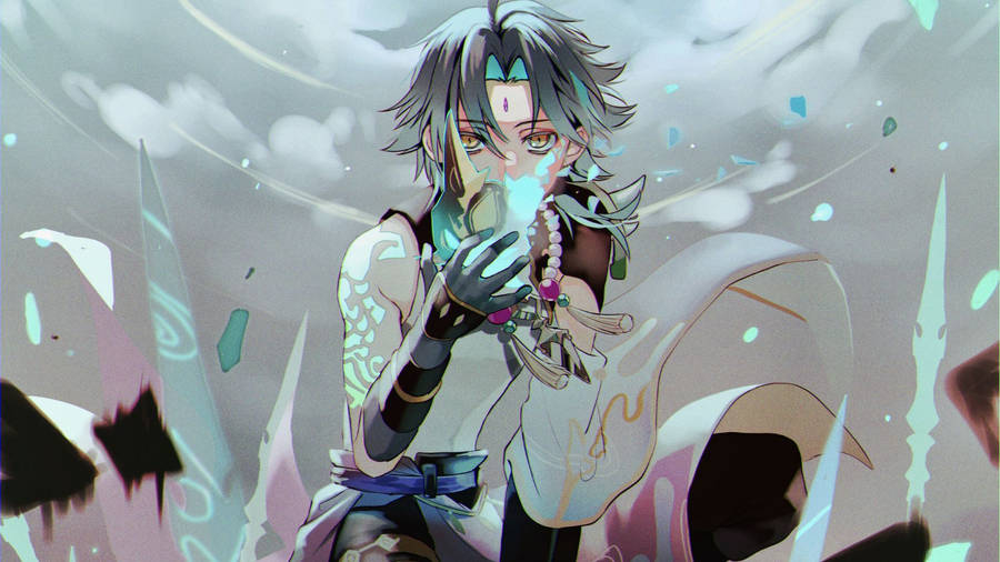 “xiao Wielding His Spear Amidst The Fiery Glow” Wallpaper